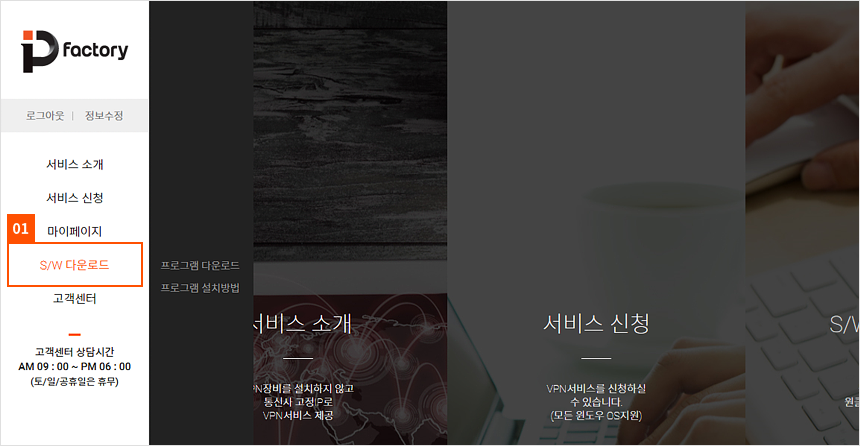 - 01 홈페이지의 S/W다운로드 버튼을 클릭하여 프로그램을 다운로드 해주세요.