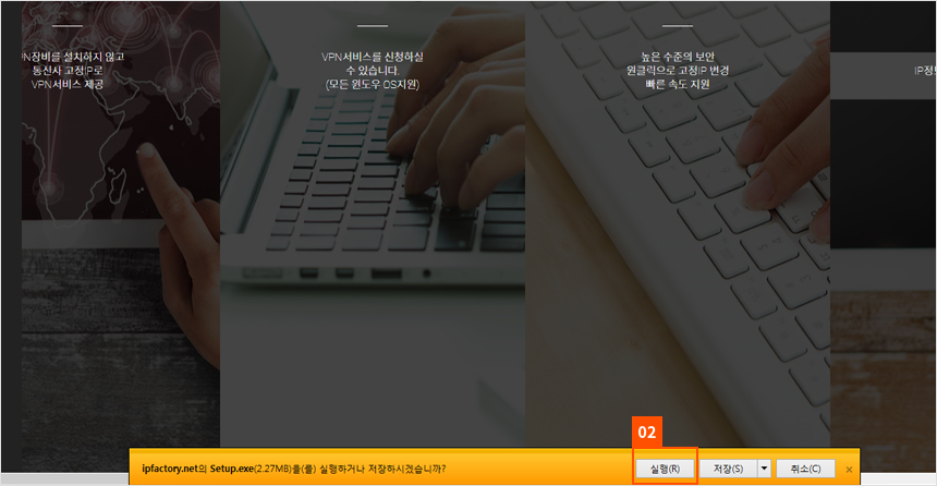 - 02 다운로드 실행창이 뜨면 "실행"을 클릭해주세요. 클릭 시, 프로그램 설치가 시작됩니다.