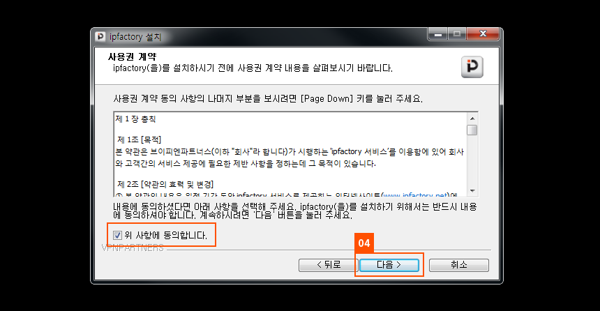 - 04 사용권 계약에 대한 내용을 확인하신 후 "동의"를 체크해주시고 "다음"을 클릭해주세요.