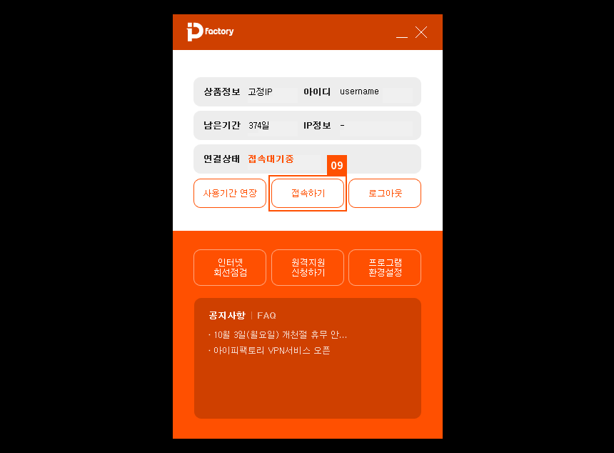 로그인 후 "접속하기" 버튼을 클릭하여 IP정보와 연결상태를 확인하세요.